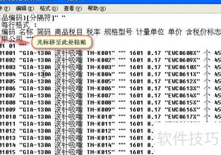 7、 打开之前保留表头的商品编码TXT文件,将光标定位到表头下方第一行的起始位置,单击鼠标右键选择粘贴,或使用Ctrl+V快捷键完成操作。