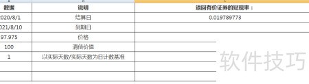 14、 按下回车键确认后,系统将立即显示该单元格的计算结果,可快速得出有价证券贴现率为0.019789773。