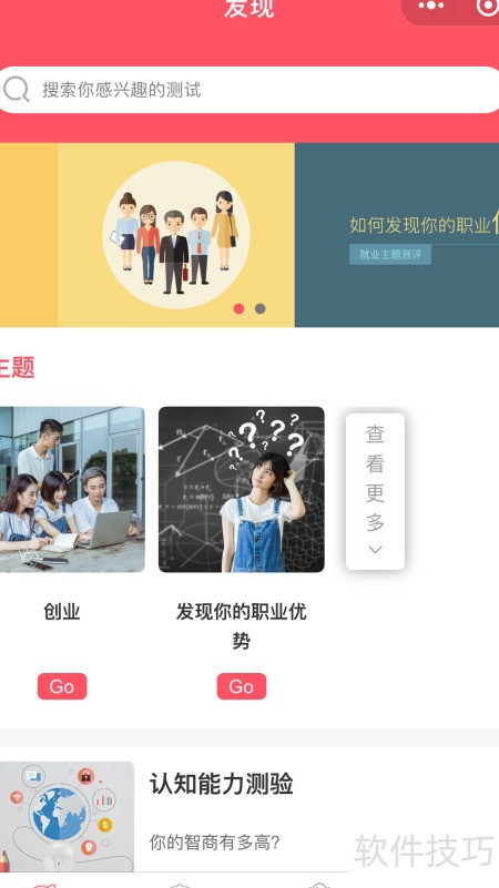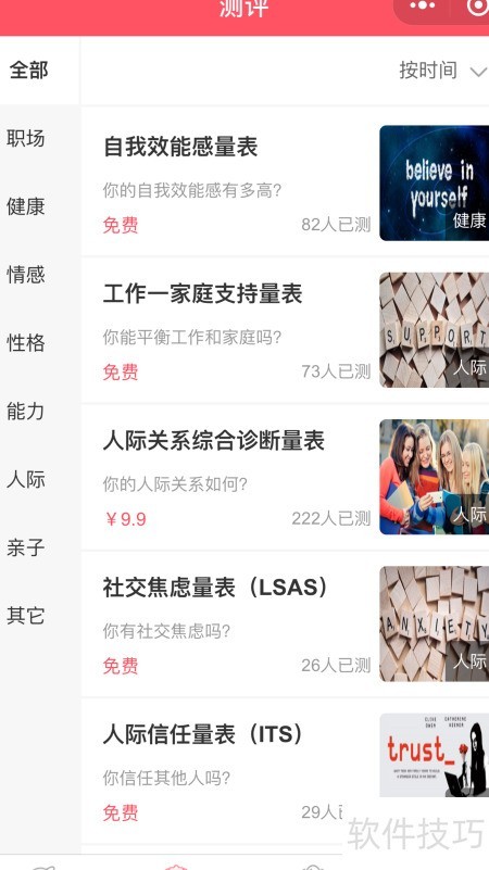1、 打开职场趣心里微信小程序,进入后点击测评栏目,在测评中心查看量表介绍并选择所需量表进行测试。