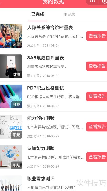 4、 量表库展示全部量表详情,完成测评后可在报告中查阅相关人员列表信息。