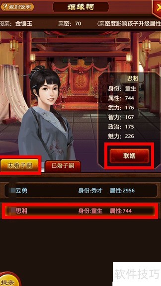 10、 前往媒婆处查看未婚成年子女,选定欲婚配者后点击联姻即可。