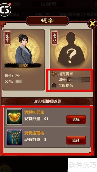 12、 所示,点击提亲按钮。若选择全服提亲,则勾选全服选项;否则输入对方玩家编号,并扣除相应元宝或道具即可完成操作。