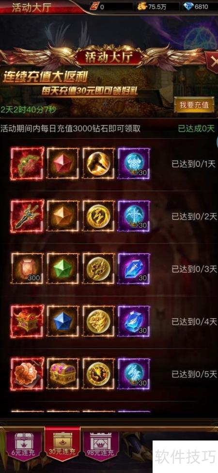5、 在活动大厅累计充值后,务必记得按充值天数领取相应奖励,切勿遗漏。