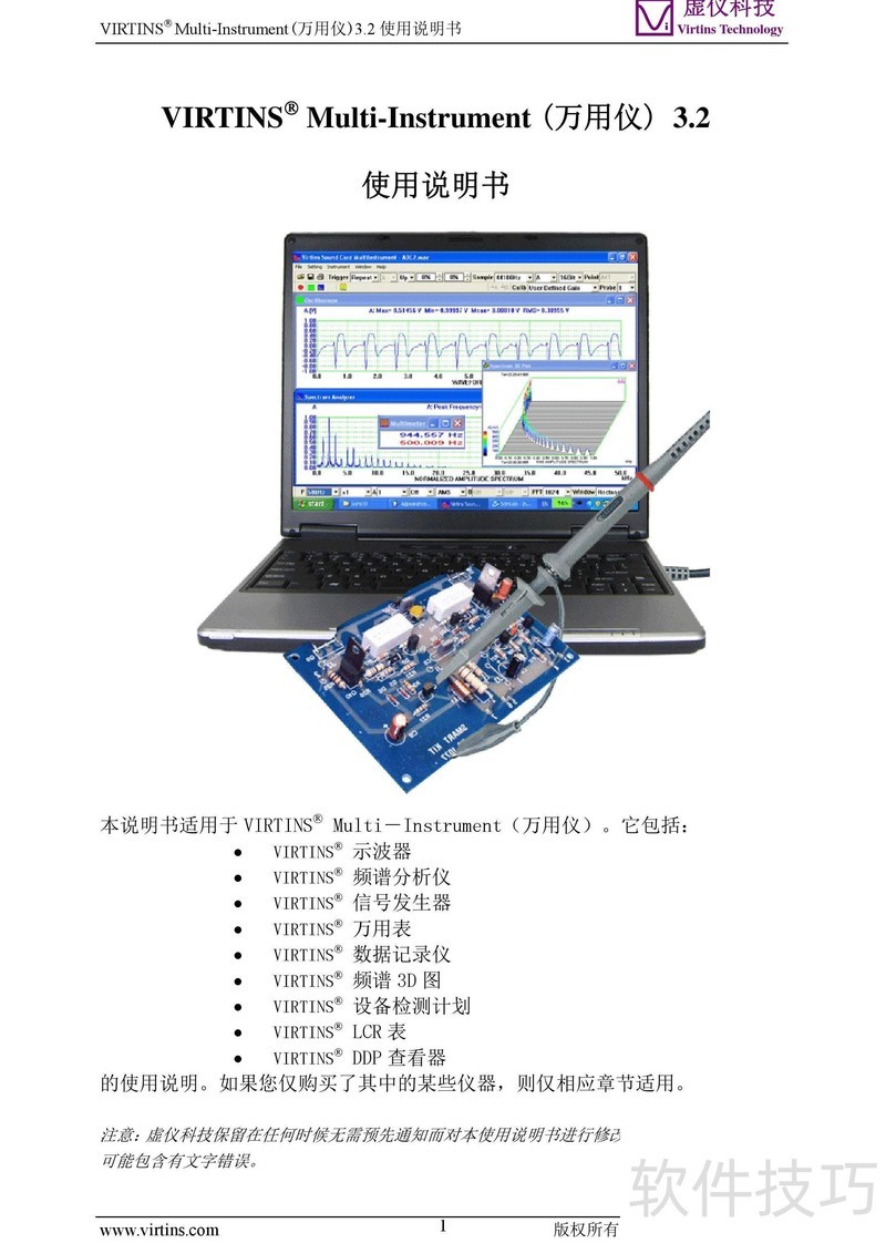 、 本书是VIRTINS Multi-Instrument万用仪3.2版使用说明书,详细讲解产品操作步骤与常见问题处理方法,帮助用户快速掌握仪器功能,提升使用效率,确保测量准确可靠。