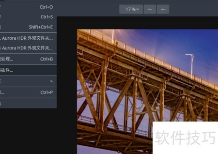 12、 完成汉化后,首次启动软件即显示中文界面,可无限制地使用Aurora HDR。通过文件菜单中的安装插件选项,点击安装Photoshop与Lightroom插件,即可将Aurora HDR作为Lightroom和Photoshop的插件进行调用与操作,实现无缝协作与高效编辑,提升图像处理工作流程的便捷性与实用性。