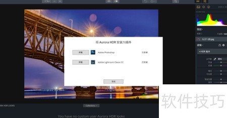6、 汉化完成后,首次启动软件即显示中文界面,可无限制地使用Aurora HDR功能。通过文件菜单中的安装插件选项,点击安装Photoshop与Lightroom插件,即可将Aurora HDR作为Lightroom和Photoshop的插件直接调用,实现无缝协作,提升后期处理效率。