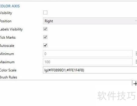 21、 可对三个坐标轴分别设置标签和刻度的显示与否、位置及可见性。颜色轴 additionally 支持设定最小值和最大值,数值可为静态数字或动态数据源,具体6所示。