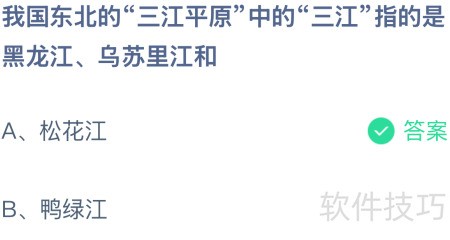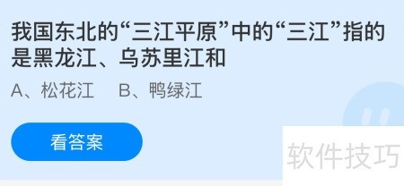 我国东北三江平原中的三江指的是黑龙江、乌苏里江和松花江。想知道具体是哪三条江?只需两步操作,进入蚂蚁庄园游戏,跟随指引即可轻松获取答案,一起来完成今日的知识小任务吧。