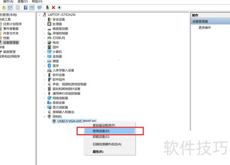 4、 将鼠标悬停在USB2.0 VGA UVC WebCam上,右键单击并选择禁用设备即可。