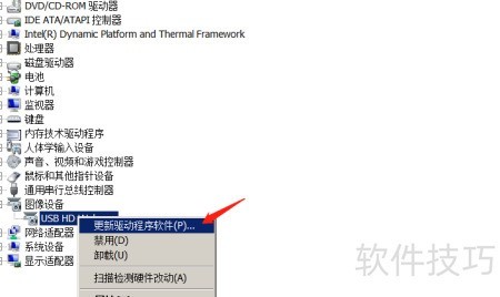 4、 右键点击USB高清摄像头,选择更新驱动程序软件。