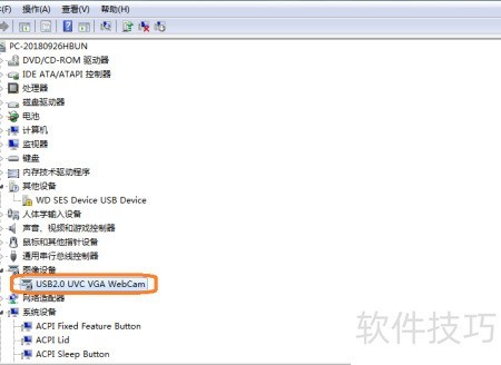 4、 在设备管理器中展开图像设备,若列出USB 2.0 UVC VGA WebCam,即表示系统已识别并安装了摄像头驱动程序。