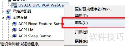 13、 右键点击USB 2.0 UVC VGA WebCam驱动,从菜单中选择卸载即可完成操作。