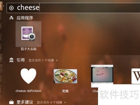 2、 以 Ubuntu 系统为例,按下 Win 键打开启动器,在搜索栏输入 Cheese,找到名为茄子大头贴的应用,按回车键即可启动使用。