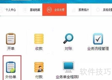 1、 启动软件后,进入业务处理页面,选取外协单选项,系统随即弹出外协单制作界面供操作。