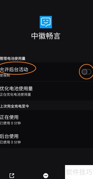 打开中徽畅言应用,进入电池设置,点击允许后台活动右侧按钮即可开启。