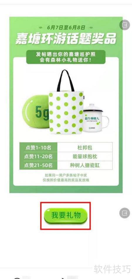 3、 进入森林礼物图文页,浏览趣味内容,上滑发现嘉塘环游话题奖品,点击下方我要礼物即可领取。
