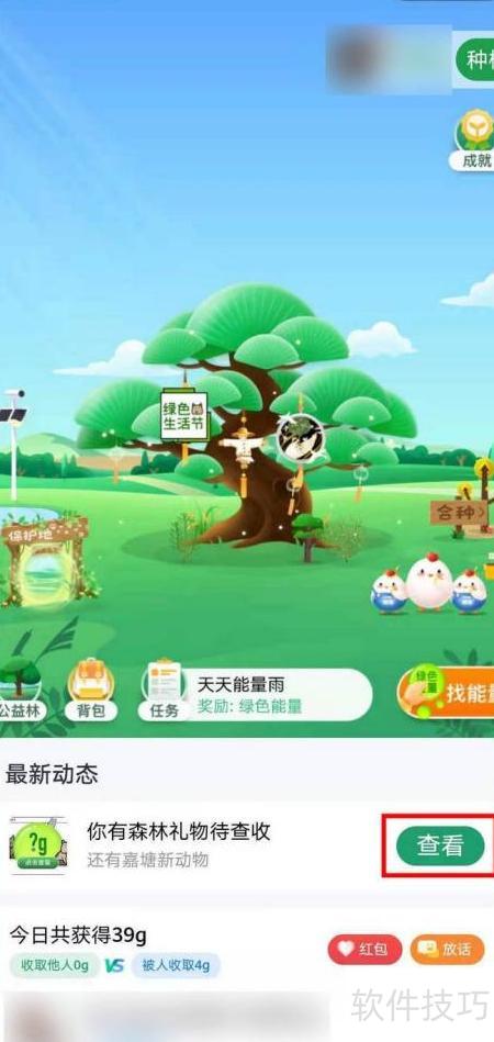 2、 打开蚂蚁森林,最新消息提示有礼物待领取,点击查看详情即可。