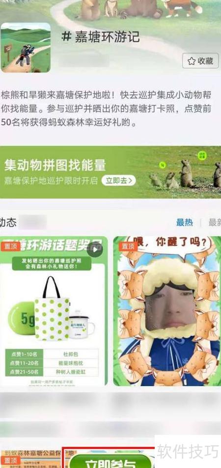 支付宝蚂蚁森林嘉塘保护地推出嘉塘环游记新话题,用户参与晒出动态即可赢取奖品。想知道如何加入并获取奖励?一起来了解具体参与方式吧。