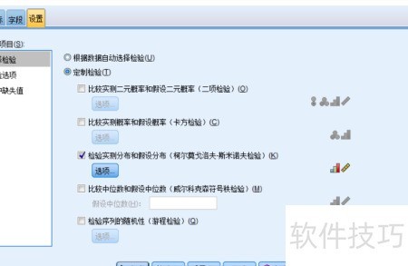 4、 进入分析菜单,选择非参数检验中的单样本选项;切换至字段界面,将待检验变量移入右侧区域;转到设置选项,勾选定制检验并选择K-S检验;在选项中因缺乏正态分布的已知参数,故设定为使用样本数据估算;最后确认设置并运行,即可获得检验结果。