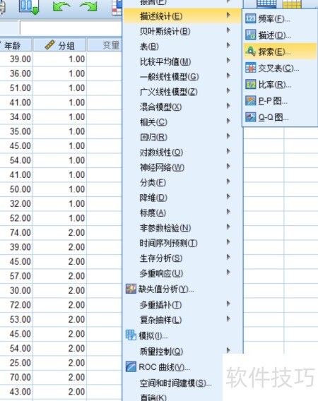 7、 依次点击分析、描述统计、探索,将年龄移入因变量列表,分组移入因子列表。