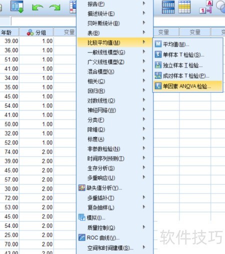 13、 选择分析功能中的比较平均值,进入单因素ANOVA检验,将年龄作为因变量,分组作为因子变量进行分析。