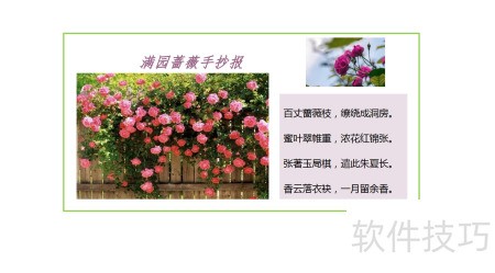5、 在图框右下角添加文字,详细说明满园蔷薇手抄报的内容与设计特点。
