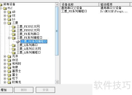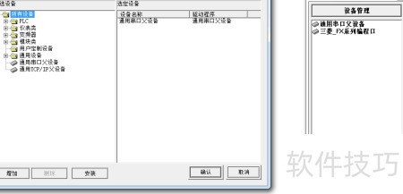 9、 依次展开左侧窗口中的PLC选项,选择三菱品牌下的FX系列编程口,点击单机添加并确认。完成操作后,设备工具箱中将显示三菱-FX系列编程口选项,表明组件已成功选中并配置完毕。