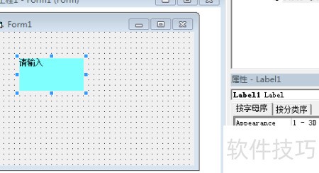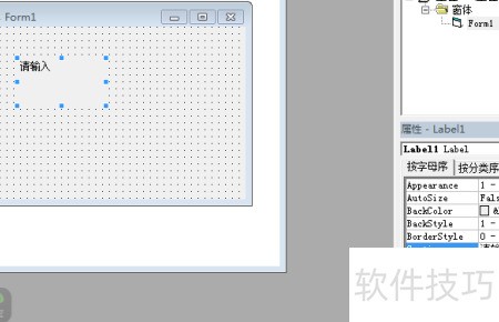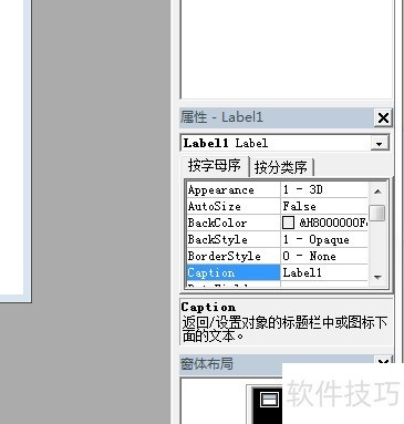 3、 右下角是label控件的属性设置区域,其中蓝色高亮部分为Caption属性,通过在右侧输入文字,可直接修改该控件显示的名称内容。