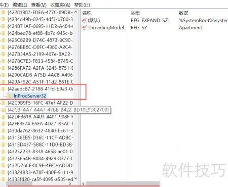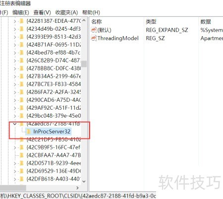 2、 进入注册表编辑器后,通过双击左侧目录逐级展开注册表分支,依次导航至 HKEY_CLASSES_ROOTCLSID{42aedc87-2188-41fd-b9a3-0c966feabec1}InProcServer32 路径,确保准确找到目标子项,以便后续进行相关配置或修改操作,操作时需谨慎,避免误改其他关键注册表项。
