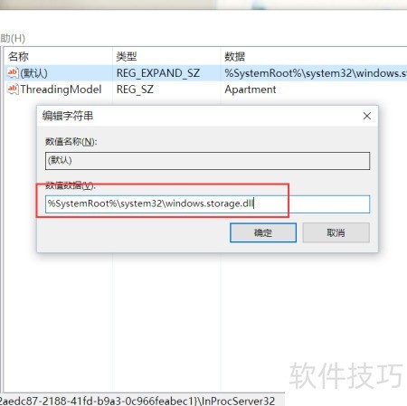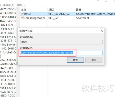 6、 在右侧页面中定位到名为默认的子项,将其键值更改为%SystemRoot%system32windows.storage.dll,完成后点击确定,保存对注册表的修改即可。