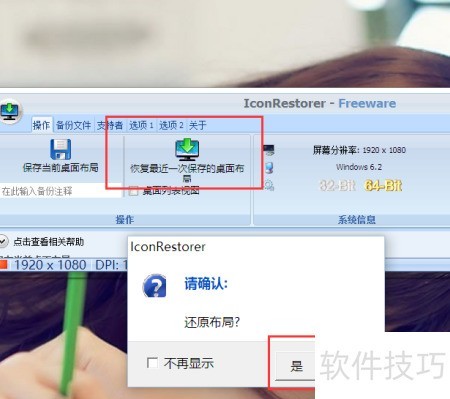 11、 点击软件界面上的恢复最近一次保存的桌面布局按钮,可快速还原之前的桌面图标排列。若发现图标混乱,使用此功能即可一键恢复整齐布局,操作简便,建议大家立即体验这一实用功能。