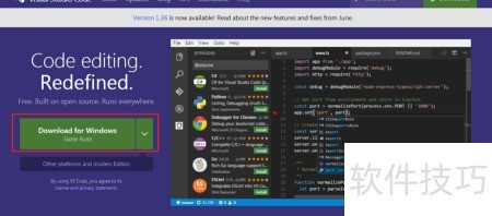 1、 在浏览器搜索栏输入VS Code,进入官网后找到并点击Download for Windows按钮,开始下载适用于Windows系统的安装程序。