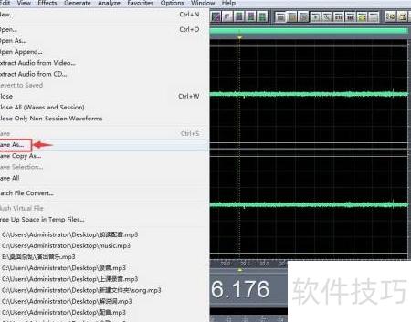 7、 点击文件,选择另存为,保存录制的音乐,即可完成录音操作。
