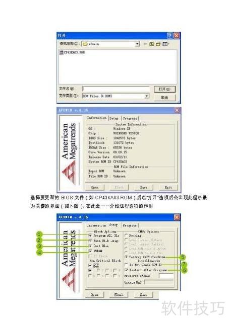 112、 选择需更新的BIOS文件(例如CP43KA03.ROM)并点击打开后,将进入程序的核心界面。该界面包含多个选项,每个选项均有特定功能,下文将逐一说明其具体作用。