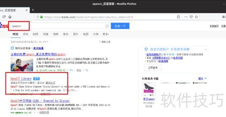 1、 启动虚拟机浏览器,搜索opencv,点击结果中红色框选的官网链接进入。