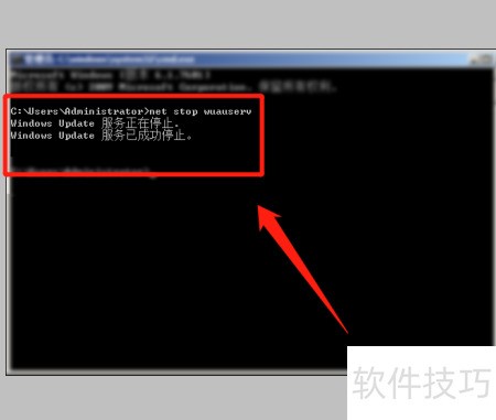 7、 在打开的黑色窗口中输入 net stop wuauserv 并按下回车键执行命令。