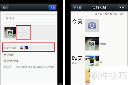 4、 用户可在个人相册中拍摄照片,并持续添加新作品。照片可按组发布,自动附带拍摄地点信息。根据隐私需求,自由设置可见范围,选择特定好友查看,或直接同步至微博公开分享,灵活掌控展示对象与方式,满足不同场景下的使用需求。