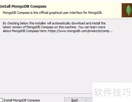 5、 在安装MongoDB Compass的对话框中,取消勾选Install MongoDB Compass选项,随后点击下一步,具体操作所示。