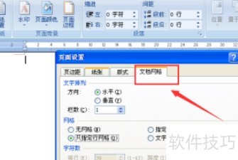 2、 进入页面布局菜单,打开页面设置对话框,选择文档网格选项进行配置。