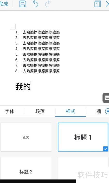 6、 在编辑界面中,段落右侧设有样式选项,可对选定内容进行格式调整。所示,将文字设置为一级标题后,其字体加粗且字号增大,呈现明显的标题效果。
