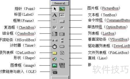 7、 控件工具箱又称工具箱,通常位于VB主窗口的左下角,1.1所示。它为软件开发人员在设计应用程序界面时提供常用的控件工具。这些控件以图标形式分类存放于工具箱中。开发人员可从中选择所需控件,在窗体上通过拖放操作绘制出所需的用户界面。每个控件对应特定功能,用于构建按钮、文本框、标签等界面元素。常用控件的图标及其名称示例见图1.2,便于快速识别与使用。