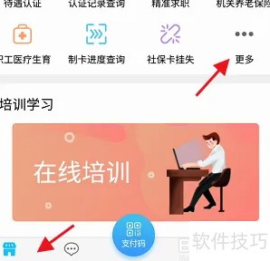 1、 登录青海人社通APP后,点击主页左下角,再点右上角更多选项进入。
