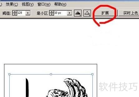 3、 将图片转为位图并保存为AI格式,导入AI后选中图像,执行描摹并确认,随后点击扩展即可完成处理。