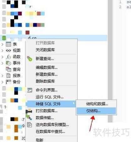 4、 将鼠标移至数据库,右键点击,选择转储SQL文件,再选仅结构选项。