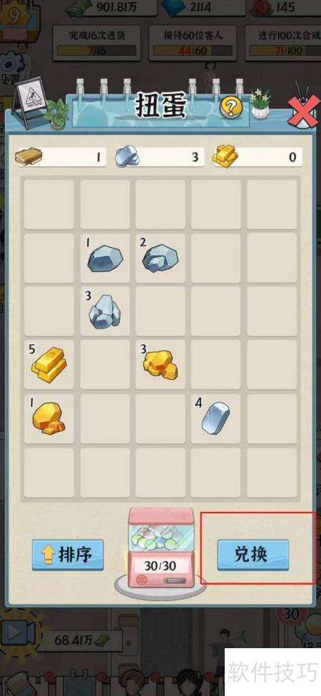 1、 进入游戏后,在扭蛋界面点击兑换按钮即可。