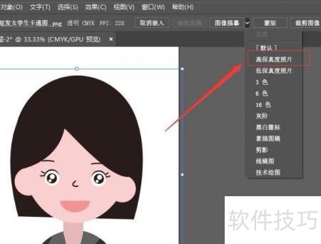 4、 在选项栏中,点击图像临摹旁边的下拉箭头,从菜单中选择高保真度照片即可,操作所示。