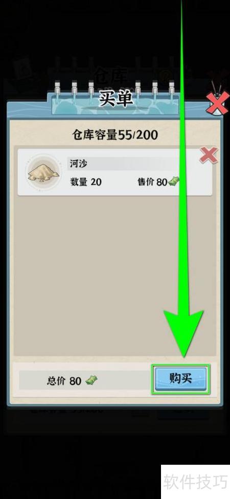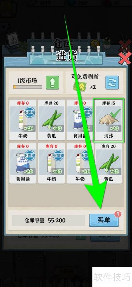 3、 在进货页面选择河沙,再点击下方买单按钮。