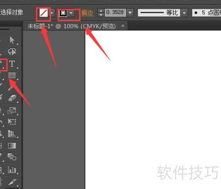 1、 开启AI后,在工具箱中选取钢笔工具,并在上方选项栏中按图示调整其参数设置。