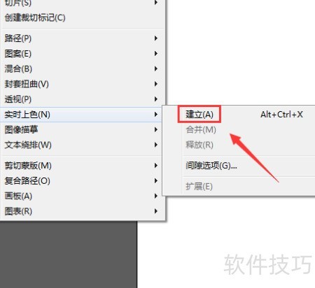 4、 设置颜色后,在对象菜单中找到实时上色,点击并选择其子菜单中的建立选项,操作所示。