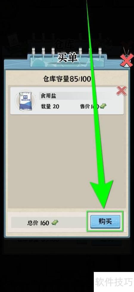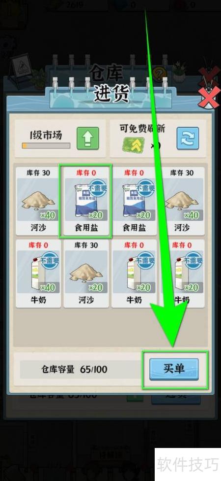 3、 在进货页面选择食用盐,再点击底部买单按钮完成操作。